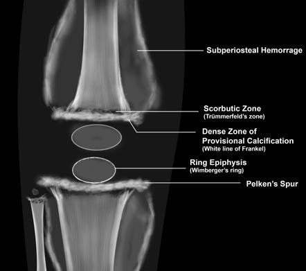 • “Trümmerfeld zone” or scorbutic zone (an area of lucency in the metaphysis).