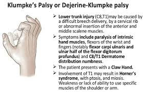 Klumpke’s paralysis caused by injury in lower trunk of brachial plexus (C8, T1) characterized by paralysis of intrinsic hand Ms & C8/T1 dermatome distribution numbness.